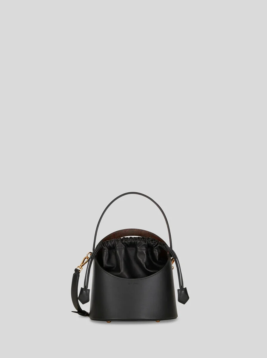 Leather Saturno bucket bag from the Women's Fall-Winter 2023 Fashion Show collection. The bag stands out for its oval handle and inner body made with a drawstring. The Saturno bag is perfect to be worn either with the handle or the shoulder strap. PRODUCT DETAILS • 22,3 x 16 x 23 cm / 8.77 x 6,29 x 9,05 inches • Exterior: Paisley fabric: Front: 76% cotton, 24% polyester; Rear: 100% cotton • Coating_PVC • Details: 100% calfskin • Interior: 100% lambskin • Drawstring fastening • Inside patch pocket • Short handle length 57 cm / 22, 44 inches • Adjustable and detachable shoulder strap length (drop) 49 cm / 19,29 inches • ETRO logo and Pegaso on the bottom • Metal feet • Made in Italy