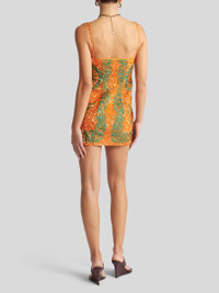Straight-cut mini dress in overdyed cotton- and silk-blend fabric with two-way zip closure at the front. This straight-neck garment has spaghetti straps, is covered in shiny embroidered sequins and features a contrasting and placed fil coupe jacquard floral motif with stencil-like effect. The item was presented at the Spring-Summer 25 Women's Runway Show. • Slim fit • Straight neck • Sleeveless • Thin shoulder straps • Zip closure at the front • Made in Italy • The model is 5' 9½" (177 cm) tall and wears a size 40 PRODUCT DETAILS • 44% cotton, 30% silk, 26% polyester • Motif: 90% cotton, 10% nylon • Embellishment: PVC and glass • Lining: 100% cotton