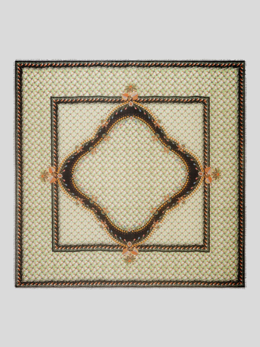 Mixed cashmere and silk shawl decorated by a Floralia floral print and features placed contrasting edging with flowers and apples. PRODUCT DETAILS • 140 x 140 cm (55.11 x 55.11 incheses) • 100% modal • Made in Italy