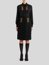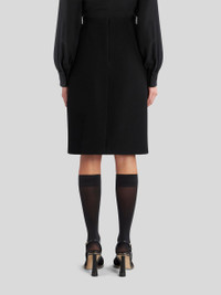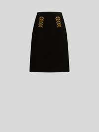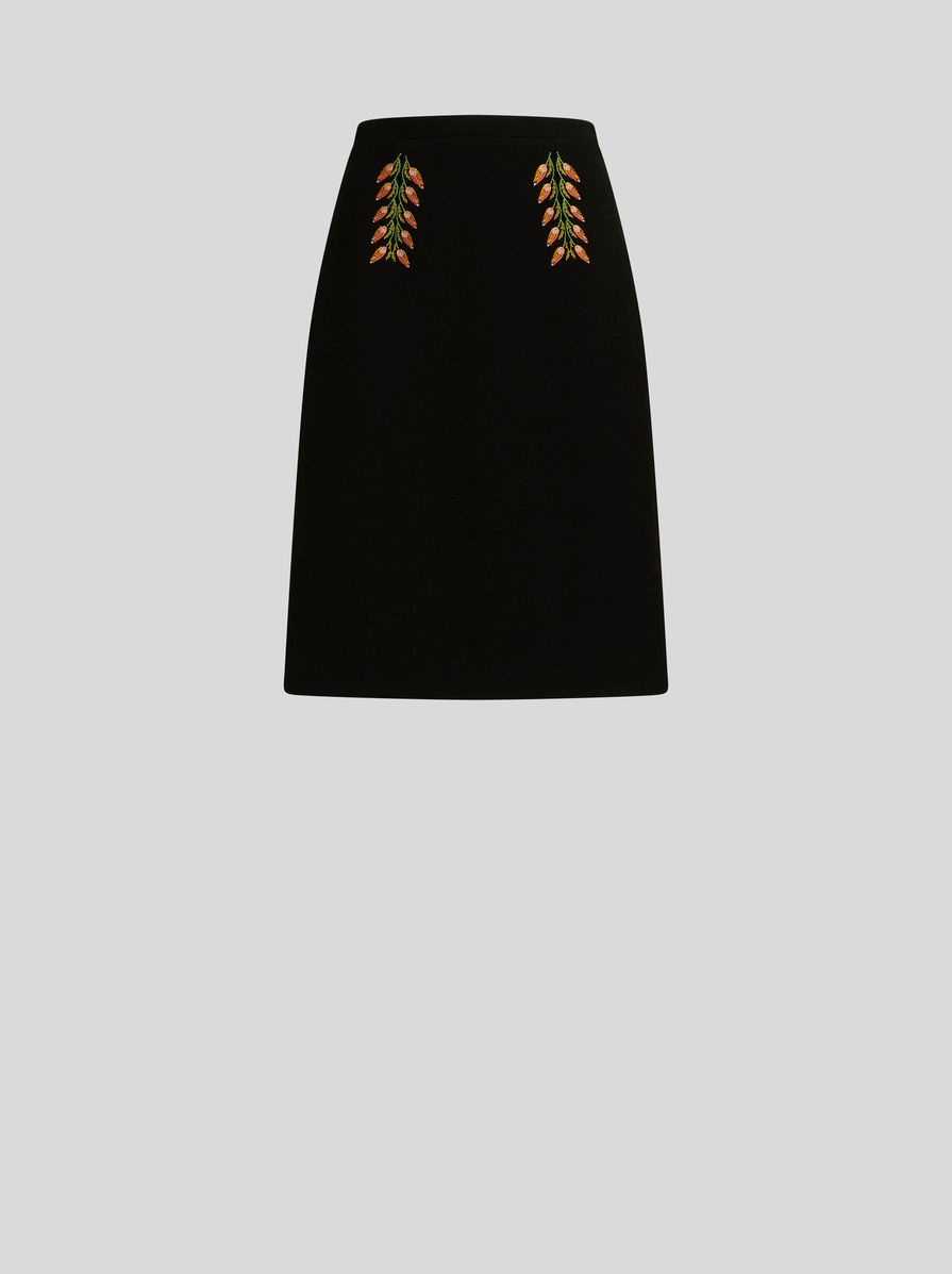 Knee-length structured mixed wool fabric sheath skirt decorated with multi-coloured foliage embroidery. PRODUCT DETAILS • 83% wool, 17% polyamide • Embroidery: 100% viscose • Interior: 52% viscose, 48% acetate • Slim fit • Rear hook and zip fastening • Made in Italy • The model is 178 cm/70 inches tall and wears size 40