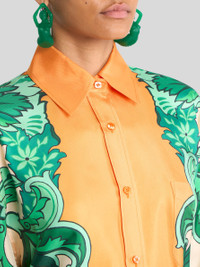 Long, fitted-waist shirt in pure silk twill. The item, presented at the Spring-Summer 25 Women's Runway Show, features a scarf-inspired maxi floral print and a knotted back. • Long, fitted-waist shape • Classic collar • Button closure • Breast patch pocket • One-button working cuffs • Made in Italy • The model is 5' 9½" (177 cm) tall and wears a size 40 PRODUCT DETAILS • 100% silk