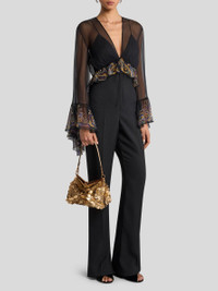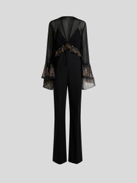 Jumpsuit in lightweight silk-blend crepon. This model stands out for its see-through-effect bodice with plunging V-neck and decorative Paisley foliage print on the wide ruffles at the waist and cuffs. The relaxed-fit trousers complete the design. • Slim fit • V-neck • Tie fastening at the front • Wide long sleeves • Made in Italy • The model is 5' 9½" (176 cm) tall and wears a size 40 PRODUCT DETAILS • Top part: 100% silk • Trousers: 100% polyester • Bodice lining: 100% polyester
