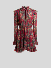 Mini dress in lightweight silk-blend crepon. This model features a distinctive all-over floral print, a comfortable elasticated waist and small ruffles on the neck, armholes and hem. • Regular fit • Round neck with opening and bow • Long sleeves • Elasticated waist • Made in Italy • The model is 5' 9½" (177 cm) tall and wears a size 40 PRODUCT DETAILS • 80% viscose, 20% silk • Lining: 100% polyester