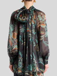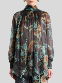 Blouse in washed, see-through-effect pure silk organza with decorative all-over daffodil print. This model is complete with a turtleneck with long silk scarf that ties into a knot and enhanced by delicate gathering at the neck and sleeves. The item was presented at the Autumn-Winter 25 Runway Show. • Regular fit • Turtleneck with silk scarf • Long raglan sleeves • Buttoned working cuffs • Made in Italy • The model is 5' 9½" (176 cm) tall and wears a size 40 PRODUCT DETAILS • 100% silk