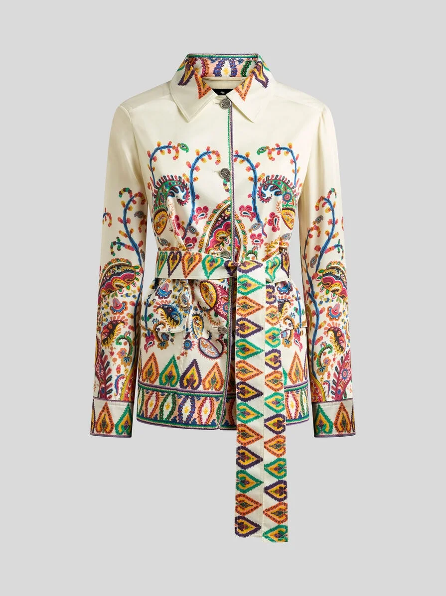Field jacket in pure silk twill fabric with elegant, placed, multicoloured floral Paisley print and geometric motif along the edges. This item features two large pockets with flap and a soft matching waist tie belt. Completing the garment are metal buttons with a raised Pegaso logo. • Regular fit • Pointed collar • Fastened with Pegaso buttons • Front pockets with flap • Matching waist tie belt • Made in Italy • The model is 5' 9½" (176 cm) tall and wears a size 40 PRODUCT DETAILS • Exterior: 100% silk • Lining: 100% polyester