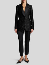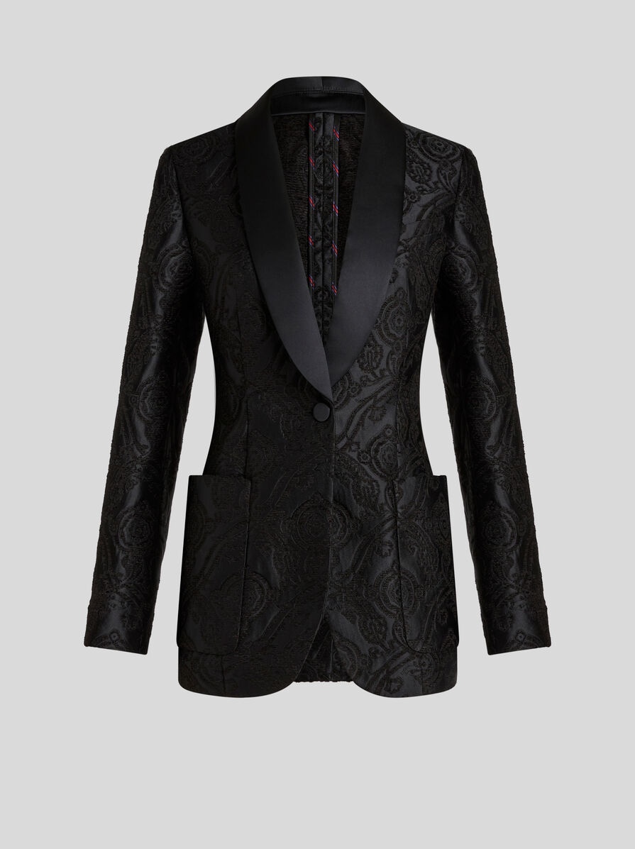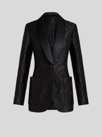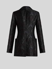 Single-breasted jacket in silk- and chenille-blend jacquard fabric with shawl lapels and tone-on-tone medallion motif. PRODUCT DETAILS • 40% acrylic, 20% viscose, 15% polyester, 13% acetate, 12% silk • Details: 100% polyester
