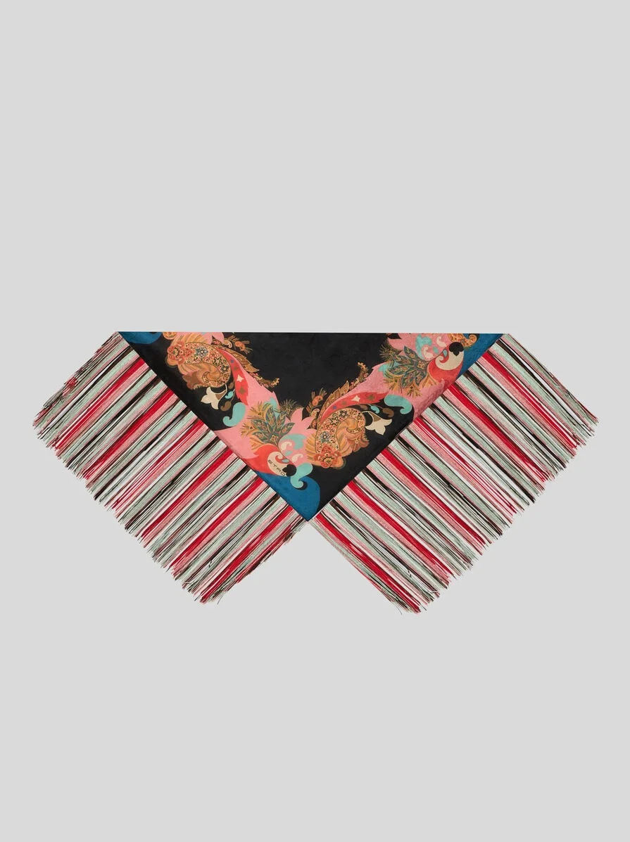 Pure silk jacquard scarf with distinctive multicoloured print featuring a floral Paisley motif and long fringes matching the colours of the main pattern. Presented at the Spring/Summer 26 Runway Show, this accessory is complete with the ETRO logo in one corner. • Size: 19.7 x 19.7 inches (50 x 50 cm) • Made in Italy PRODUCT DETAILS • 100% silk