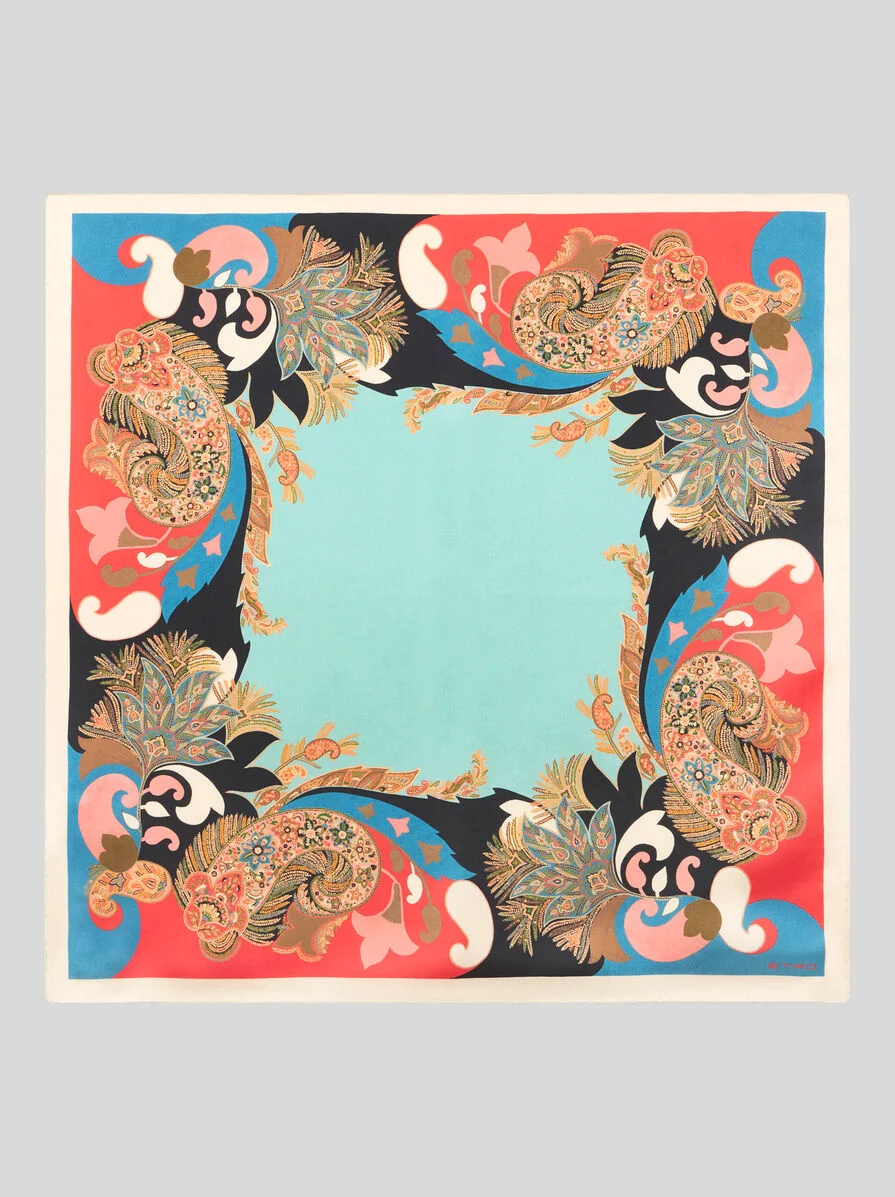 Pure silk twill scarf with distinctive multicoloured print featuring a floral-inspired Paisley motif and contrasting edges. Presented at the Spring/Summer 26 Runway Show, this accessory is complete with the ETRO logo in one corner. • Size: 27.6 x 27.6 inches (70 x 70 cm) • Made in Italy PRODUCT DETAILS • 100% silk