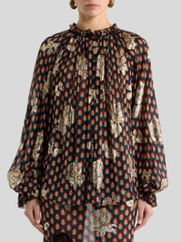 Relaxed-fit shirt in lightweight silk embellished with a colourful, tie-inspired micro motif all over, superimposed with elegant fil coupe embroidered roses. This garment, complete with small ruffles on the front and back, features long balloon sleeves with a ruffle- and ribbon-adorned stretch cuff and a crew neck with ruffled edge. The item was presented at the Spring/Summer 26 Runway Show. • Easy fit • Ruffled crew neck • Long puff sleeves • Stretch cuffs with ruffles and ribbon • Branded-button closure • Made in Romania • The model is 5' 9½" (176 cm) tall and wears a size 40 PRODUCT DETAILS • 83% silk, 17% metallised fibre