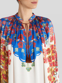 Silk faille tunic dress embellished with a placed leafy floral print with mythological animals and features a lace with tassels. PRODUCT DETAILS • 100% silk • Oversize • Mandarin collar with V pattern and tassels • Long sleeves • Made in Italy • The model is 178 cm tall and wears size 40 Sku: 222D1328651290990