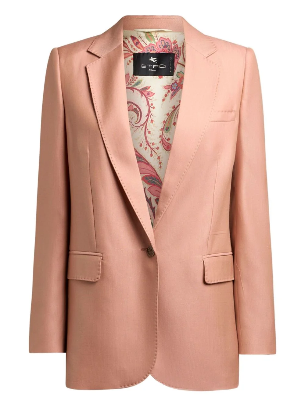 single-breasted blazer Highlights - Pink - Single button fastening - Notched lapel - Long sleeves - Straight hem - Paisley pattern lining Made in Italy Composition Wool 81%, Viscose 19% Washing instructions Dry Clean Only