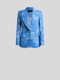 Slim-fit jacket in slightly stretchy cotton- and linen-blend denim with all-over floral jacquard motif. This item features three large patch pockets on the front and is complete with a single-breasted closure with Pegaso buttons. • Slim fit • Peak lapels • Single-breasted two-button closure • Three front patch pockets • Rear vent • Made in Italy • The model is 5' 9½" (176 cm) tall and wears a size 40 PRODUCT DETAILS • Exterior: 62% cotton, 37% linen, 1% elastane • Lining: 52% viscose, 48% acetate