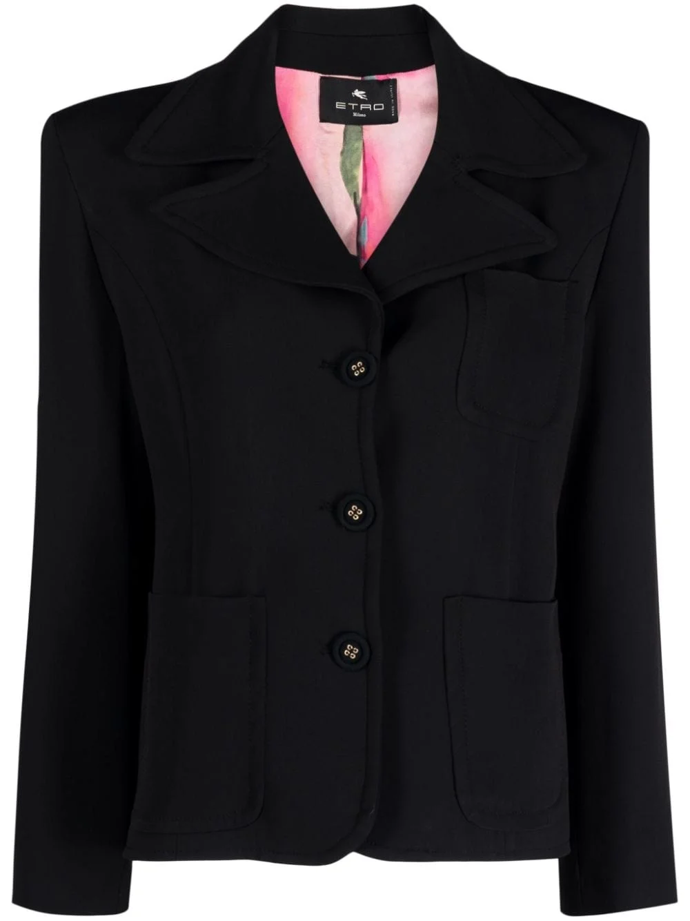single-breasted patch-pocket blazer ETRO gained fame almost immediately for its quality products and that legacy continues today. A case in point, this blazer is cut to a slim-fitting silhouette and features a front button fastening. Highlights - Black - Notched lapels - Front button fastening - Long sleeves - Chest patch pocket - Two front patch pockets - Straight hem Made in Italy Composition Outer: Viscose 66%, Acetate 31%, Elastane 3% Lining: Viscose 52%, Acetate 48% SIZE & FIT Model measurements Height 5 ft 10 in(1.78 m) Bust/Chest 29.92 in(76 cm) Hips 34.64 in(88 cm) Waist 23.62 in(60 cm) FittingInformation Designed for a slim fit that sits just away from the body offering a close yet comfortable fit The internal shoulder pads offer a structured shape Made from a midweight stretch fabric, this piece offers elasticity and flexibility when worn This piece fits true to size – take your usual size Washing instructions Dry Clean Only