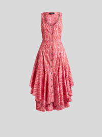 Sleeveless cotton poplin dress with asymmetric skirt and medallion and micro Paisley motif. This model is enhanced by metal buttons with a raised Pegaso logo. • Regular fit • Wide neck • Asymmetric skirt • Fastened with Pegaso buttons • Made in Italy • The model is 5' 9½" (177 cm) tall and wears a size 40 PRODUCT DETAILS • 100% cotton