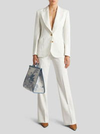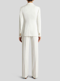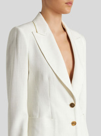 Single-breasted jacket in slub fabric. This model features peak lapels, striped inner lining and metal buttons bearing a raised Pegaso logo. • Slim fit • Peak lapels • Single-breasted closure • Metal buttons with raised Pegaso logo • Breast patch pocket • Side slip pockets • Working cuffs • The model is 70.07" (178 cm) tall and wears a size 40 (IT) • Made in Italy PRODUCT DETAILS • 86% viscose, 14% polyester • Lining: 52% viscose, 48% acetate