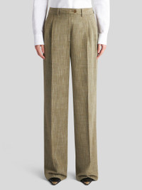 Wide-leg trousers with pressed creases and pleats, made from slub fabric. PRODUCT DETAILS • 86% viscose, 14% polyester • Regular fit with wide leg • High waist • Button and zip closure • Side pockets • Rear button-through welt pockets • Made in Italy • The model is 178 cm/ 70.07 inches tall and wears a size 40 (IT)