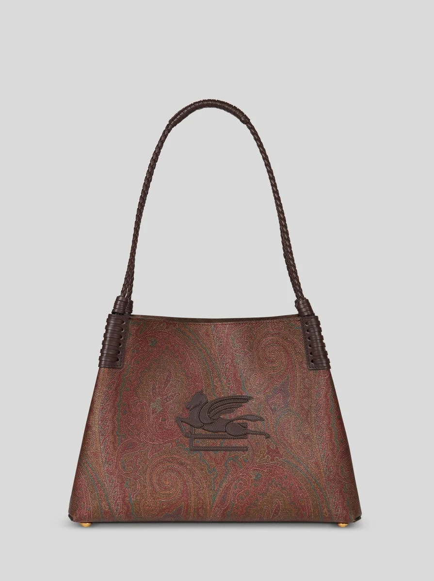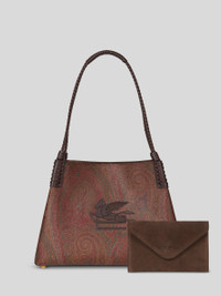 Small Libra tote bag in iconic jacquard paisley, embellished with an embroidered patch featuring the ETRO logo and Pegaso symbol on the front. This accessory features a convenient suede clutch inside. • Size: 26 x 33 x 13.5 cm • Clasp closure • Two handles • Metal feet • Made in Italy PRODUCT DETAILS • Exterior: Paisley jacquard cotton fabric coated with matt texture and lined with canvas • Coating: 100% PVC • Interior: 100% leather