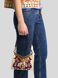 Iconic small Vela bag in raffia with three-dimensional-effect, carpet-stitched floral embroidery. This model can be carried by hand or on the shoulder, thanks to the detachable, interchangeable shoulder strap and handle. This piece stands out for its distinctive metal closure and the medallion bearing the ETRO logo and Pegaso symbol engraved using the same technique used to mint coins. • Size (Width, Height, Depth): 8.3 x 6.3 x 3.9 inches (21 x 16 x 10 cm) • Short shoulder strap, length (drop) 8.7 inches (22 cm) • Detachable adjustable shoulder strap, 21.7 inches (55 cm) long (drop) • Snap closure • Removable handle and shoulder strap • Metal feet • Golden-finish metal accessories • Made in Italy PRODUCT DETAILS • 100% nylon • Embroidery: 60% viscose thread, 30% cotton thread, 10% polyester thread • Details: calfskin