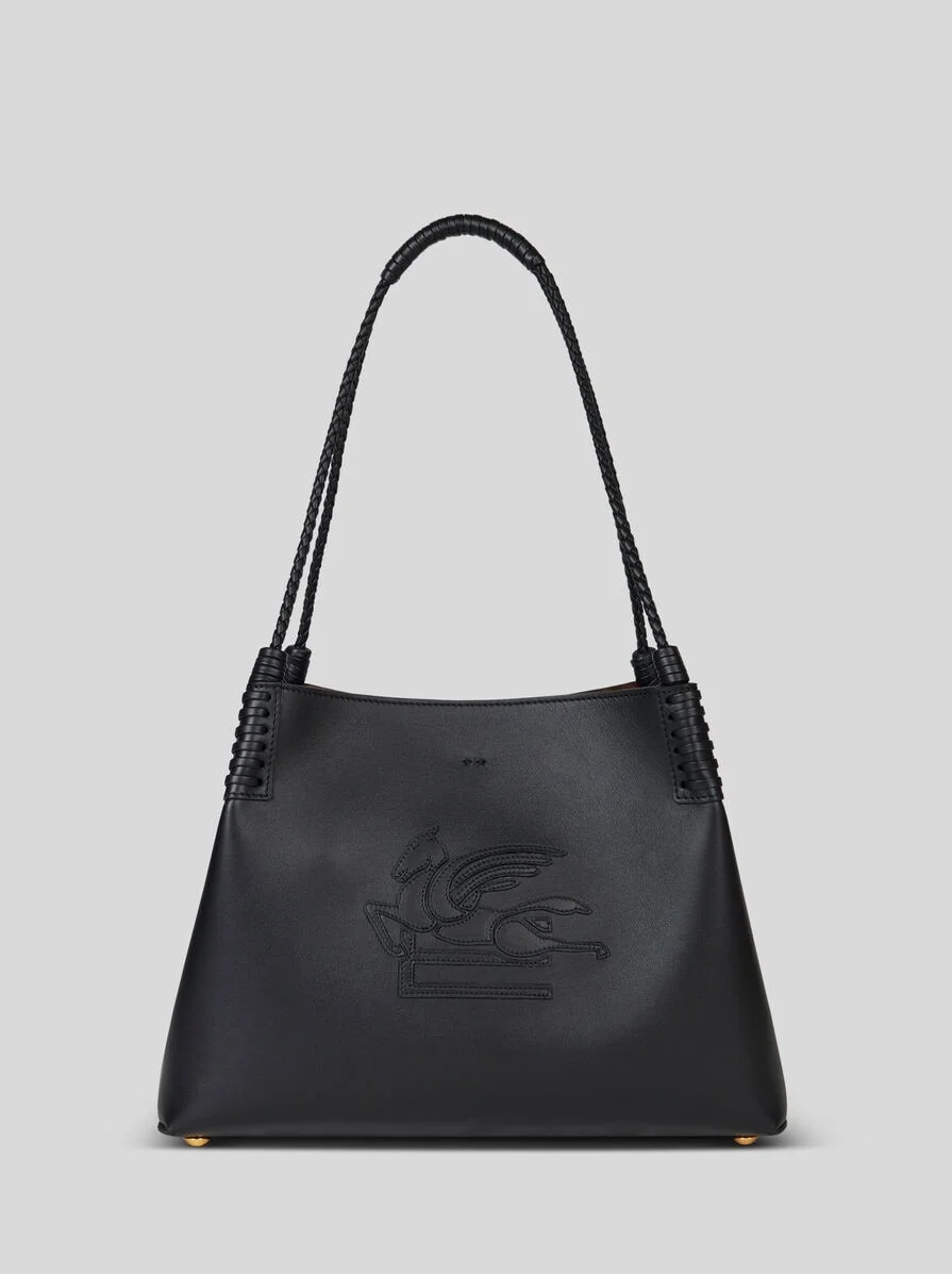 Small Libra tote bag in plain-coloured leather embellished with a leather applique featuring the ETRO logo and Pegaso symbol embroidered on the front. Braided handles and threading on the corners of the bag. Suede interior and clasp closure. This accessory features a convenient suede clutch inside. • Dimensions (Width, Height, Depth): 10.2 x 13 x 5.3 inches (26 x 33 x 13,5 cm) • Two handles • Inner D-ring • Suede lining • Metal feet • Made in Italy PRODUCT DETAILS • Exterior: 100% calfskin • Lining: 100% calfskin