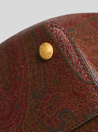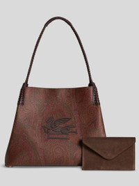 Medium Libra tote bag in iconic jacquard paisley, embellished with an embroidered patch featuring the ETRO logo and Pegaso symbol on the front. Braided handles and threading on the corners of the bag. Suede interior and clasp closure. This accessory features a convenient suede clutch inside. • Size: 29 x 39 x 16 cm • Clasp closure • Two handles • Metal feet • Made in Italy PRODUCT DETAILS • Exterior: Paisley jacquard cotton fabric coated with matt texture and lined with canvas • Coating: 100% PVC • Interior: 100% leather