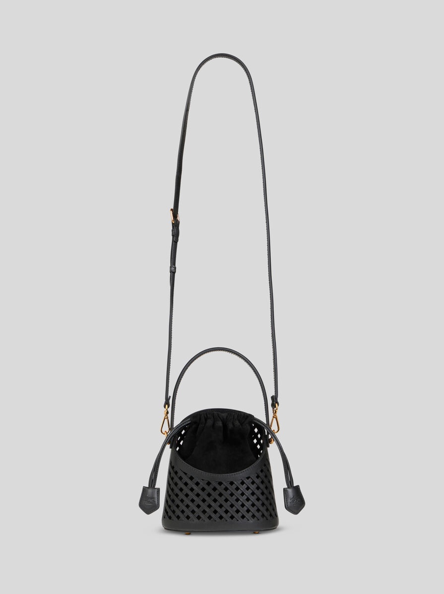 Small Saturno bucket bag in leather with cut-outs. This bag stands out thanks to its oval handle and sack-like suede inner body with drawstring. The Saturno bag is perfect to carry by the handle or shoulder strap. Features striped inner lining. PRODUCT DETAILS • 100% leather • Lining: 100% polyester
