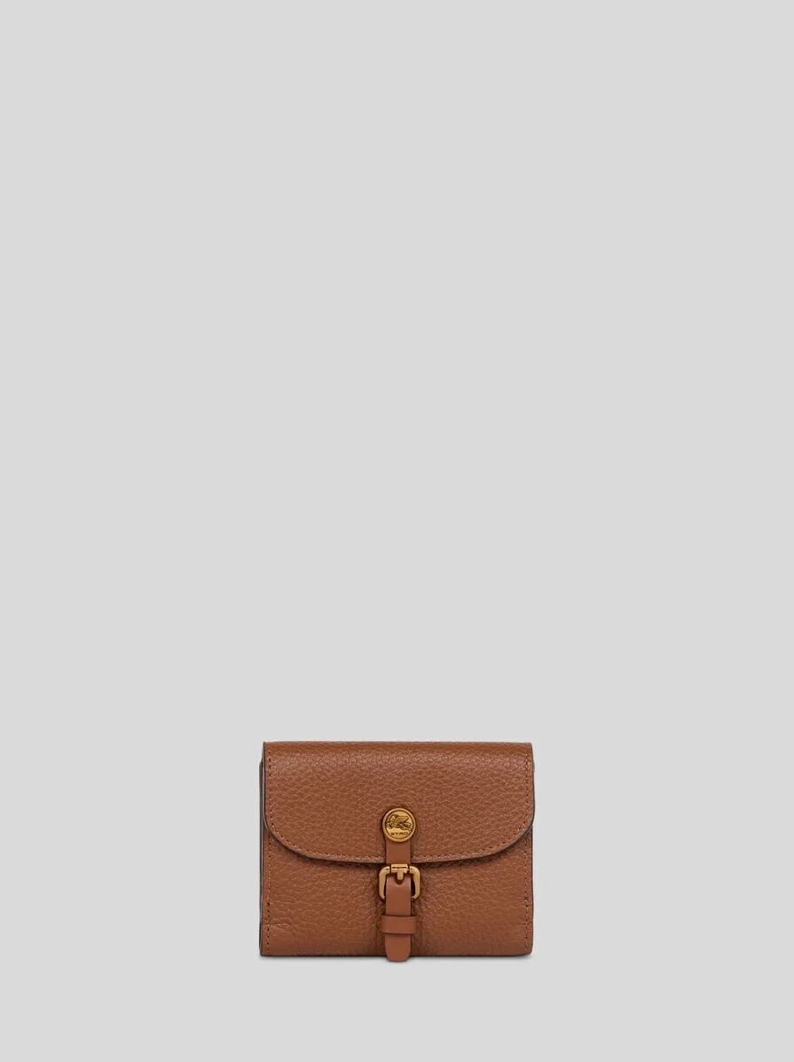 Small Pony wallet in plain-coloured tumbled leather. This accessory, presented at the Autumn-Winter 25 Runway Show, features press-stud closure on the inside, covered by a decorative metal buckle with strap and loop on the outside, and is complete with a minted metal coin with the ETRO logo and Pegaso symbol. • Dimensions (Width, Height): 4.3 x 3.3 inches (11 x 8.5 cm) • Fastened with press stud, strap and loop • Six card slots • Banknote compartment • Golden-finish metal details • Made in Italy PRODUCT DETAILS • Exterior: calfskin • Lining: 100% nylon