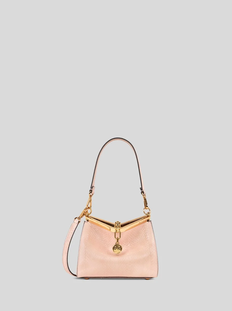 Iconic small Vela bag in fine Elaphe snakeskin whose glossy finish creates a natural ripple effect on the surface, epitomising the uniqueness of the accessory. This model can be carried by hand or on the shoulder thanks to the detachable and interchangeable strap and handle. This piece stands out for its distinctive metal closure and the medallion bearing the ETRO logo and Pegaso symbol engraved using the same technique used to mint coins. The accessory was presented at the Spring-Summer 25 Women's Runway Show. • Dimensions (Width, Height, Depth): 8.3 x 6.3 x 3.5 inches (21 x 16 x 9 cm) • Removable handle and shoulder strap • Metal feet • Light golden-finish metal details • Made in Italy PRODUCT DETAILS • 100% colubrid snakeskin (elaphe radiata) • Lining: 100% calfskin