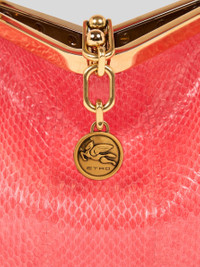 Iconic small Vela bag in fine Elaphe snakeskin whose glossy finish creates a natural ripple effect on the surface, epitomising the uniqueness of the accessory. This model can be carried by hand or on the shoulder thanks to the detachable and interchangeable strap and handle. This piece stands out for its distinctive metal closure and the medallion bearing the ETRO logo and Pegaso symbol engraved using the same technique used to mint coins. The accessory was presented at the Spring-Summer 25 Women's Runway Show. • Dimensions (Width, Height, Depth): 8.3 x 6.3 x 3.5 inches (21 x 16 x 9 cm) • Removable handle and shoulder strap • Metal feet • Light golden-finish metal details • Made in Italy PRODUCT DETAILS • 100% colubrid snakeskin (elaphe radiata) • Lining: 100% calfskin