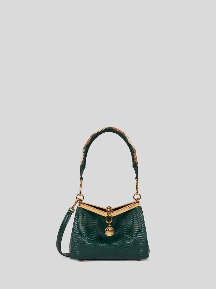 Iconic small Vela bag in leather with distinctive wavy motif. This model can be carried by hand or on the shoulder thanks to the detachable and interchangeable strap and handle. The handle stands out thanks to the original contrasting threading. This piece stands out for its distinctive metal closure and the medallion bearing the ETRO logo and Pegaso symbol engraved using the same technique used to mint coins. The accessory was presented at the Spring-Summer 25 Women's Runway Show. • Dimensions (Width, Height, Depth): 8.3 x 6.3 x 3.5 inches (21 x 16 x 9 cm) • Removable handle and shoulder strap • Metal feet • Light golden-finish metal details • Made in Italy PRODUCT DETAILS • 100% calfskin • Lining: 100% calfskin