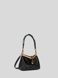 Iconic small Vela bag in leather with distinctive wavy motif. This model can be carried by hand or on the shoulder thanks to the detachable and interchangeable strap and handle. The handle stands out thanks to the original contrasting threading. This piece stands out for its distinctive metal closure and the medallion bearing the ETRO logo and Pegaso symbol engraved using the same technique used to mint coins. The accessory was presented at the Spring-Summer 25 Women's Runway Show. • Dimensions (Width, Height, Depth): 8.3 x 6.3 x 3.5 inches (21 x 16 x 9 cm) • Removable handle and shoulder strap • Metal feet • Light golden-finish metal details • Made in Italy PRODUCT DETAILS • 100% calfskin