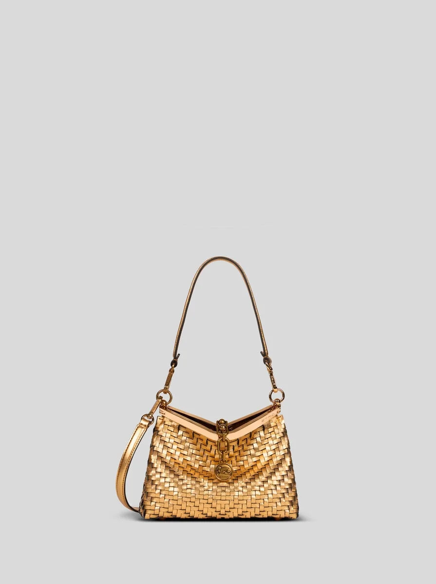 Iconic small Vela bag in metallic leather with distinctive woven detailing. This model can be carried by hand or on the shoulder thanks to the detachable and interchangeable strap and handle. This piece stands out for its distinctive metal closure and the medallion bearing the ETRO logo and Pegaso symbol engraved using the same technique used to mint coins. • Dimensions (Width, Height, Depth): 8.3 x 6.3 x 3.5 inches (21 x 16 x 9 cm) • Detachable shoulder strap • Metal feet • Golden-finish metal details • Made in Italy PRODUCT DETAILS • Exterior: calfskin • Lining: cowhide