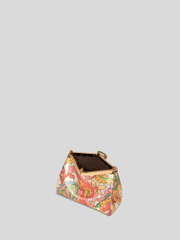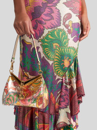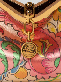 Iconic small Vela bag in laminated leather with distinctive floral motif all over. This model can be carried by hand or on the shoulder thanks to the detachable and interchangeable strap and handle. This piece stands out for its distinctive metal closure and the medallion bearing the ETRO logo and Pegaso symbol engraved using the same technique used to mint coins. The accessory was presented at the Spring-Summer 25 Women's Runway Show. • Dimensions (Width, Height, Depth): 8.3 x 6.3 x 3.5 inches (21 x 16 x 9 cm) • Removable handle and shoulder strap • Metal feet • Light golden-finish metal details • Made in Italy PRODUCT DETAILS • 100% lambskin • Lining: 100% calfskin