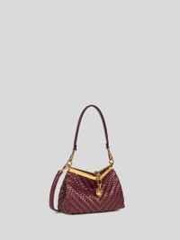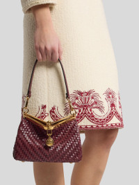 Iconic small Vela bag in plain-coloured woven leather with suede interior. This model can be carried by hand or on the shoulder thanks to the detachable and interchangeable strap and handle. This piece stands out for its distinctive metal closure and the medallion bearing the ETRO logo and Pegaso symbol engraved using the same technique used to mint coins. • Dimensions (Width, Height, Depth): 8.3 x 6.3 x 3.9 inches (21 x 16 x 10 cm) • Removable handle • Detachable shoulder strap • Metal feet • Golden-finish metal accessories • Made in Italy PRODUCT DETAILS • Exterior: leather • Lining: cowhide