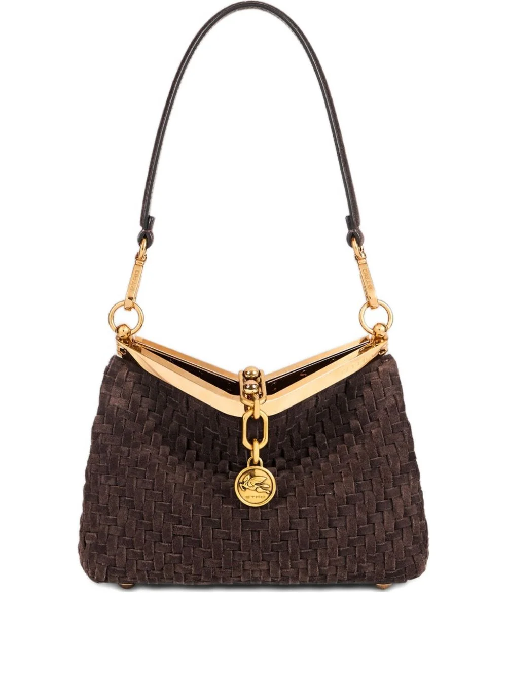 small woven-suede shoulder bag Highlights - Brown - Woven suede - Clasp fastening - Gold-tone hardware - Top handle - Single compartment Made in Italy Composition Outer: Calf Suede 100% Lining: Calf Leather 100% SIZE & FIT Measurement DEPTH 3.54 in(9 cm) HEIGHT 8.26 in(21 cm) WIDTH 6.29 in(16 cm)