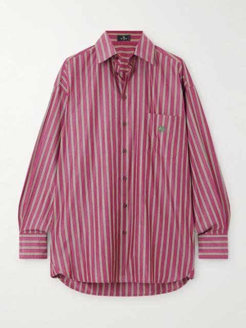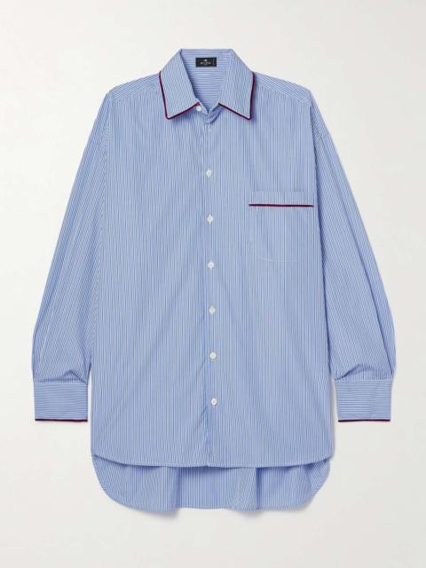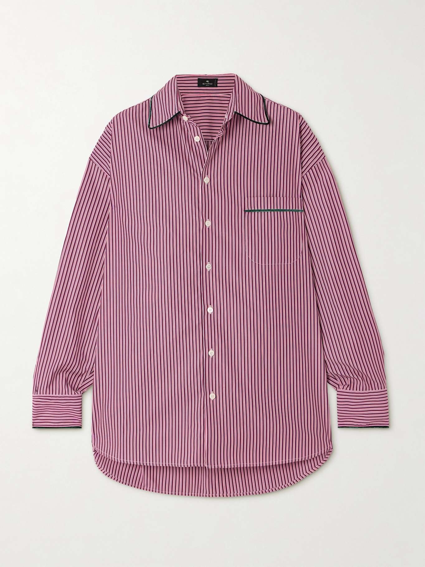 Etro’s shirt closely resembles classic pajama styles, down to the contrasting velvet piping that traces the neat collar and chest patch pocket. It's made from striped cotton-poplin for a loose fit enhanced by a longer back hem and has lustrous mother-of-pearl buttons. Size & Fit - Fits true to size, take your normal size - Designed for a loose fit - Mid-weight, non-stretchy fabric - Model is 180cm/ 5'11"and is wearing an IT 40 Model measurements: - Bust: 77cm/ 30.5” - Waist: 60cm/ 23.5” - Hip: 92cm/ 36” Details & Care - Plum, pink and white cotton-poplin, green velvet - Button fastenings through front - 100% cotton; trim: 66% nylon, 34% polyester - Dry clean - Mother-of-pearl: Indonesia