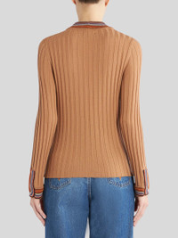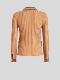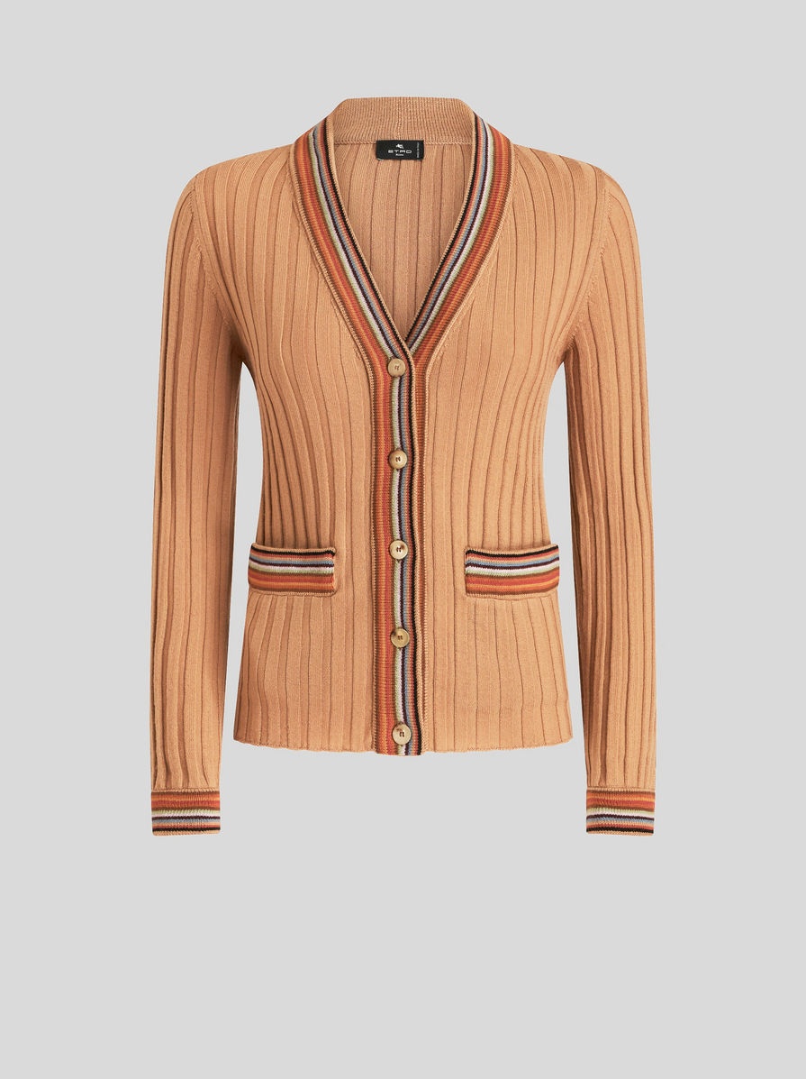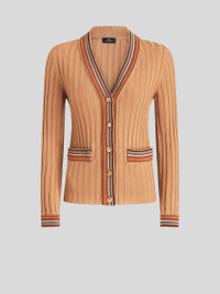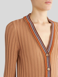 Ribbed wool cardigan featuring multi-coloured striped intarsia borders. PRODUCT DETAILS • 100% wool • Slim fit • V neck • Single-breasted button fastening • Ribbed borders • Made in Italy • The model is 178 cm / 70 inches tall and wears size 40