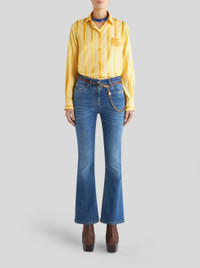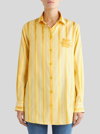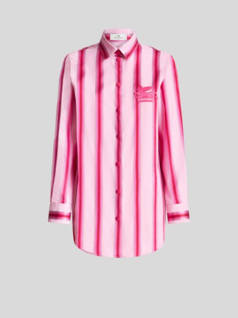 Cotton and silk shirt from the Spring-Summer 2023 Fashion Show collection with degradé colour stripes and features 3D-effect yarn-embroidered ETRO logo and Pegaso. PRODUCT DETAILS • 78% cotton, 22% silk • Regular fit • Pointed collar • Patch breast pocket • Cuffs with double button • Enamelled snap buttons with ETRO logo • Made in Italy • The model is 178 cm tall and wears size 40