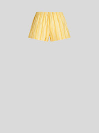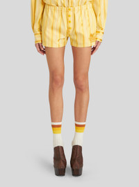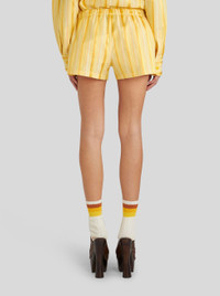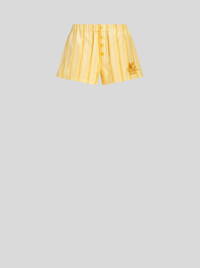 Cotton and silk shorts from the Spring-Summer 2023 Fashion Show collection featuring degradé colour stripes and embellished by yarn-embroidered ETRO logo and Pegaso. PRODUCT DETAILS • 78% cotton, 22% silk • Lining: 100% cotton • Regular fit • Elasticated waist • Decorative buttons • Side pockets • Enamelled snap buttons with ETRO logo • Made in Italy • The model is 178 cm tall and wears size 40