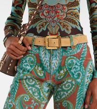 This belt from Etro is crafted in Italy from fine suede. The design features a pared-down finish and stands out with a gold-toned buckle that elevates your look. Product Details - Material: calf leather (suede) - Lining: leather - Made in Italy - Designer color name: Cammello - Item color: beige - Hardware color: gold - Closure: buckle fastening - Includes: box, dust bag - Item number: P01054882 Size & Fit - Width 3,5cm-1.5" - Buckle width 5,3cm-2"