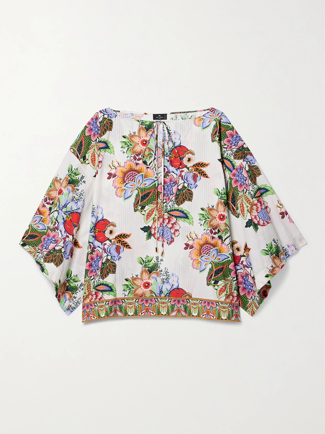 Etro's blouse is made from cotton and silk-blend voile that's printed with bouquets of vibrant flowers. It has jacquard stripes for subtle interest and texture and fluttery sleeves that add to its bohemian feel. Wear yours as a matching set with the coordinating shorts or with a denim skirt, leaving the front-ties undone.
