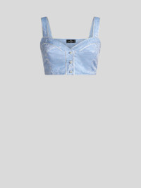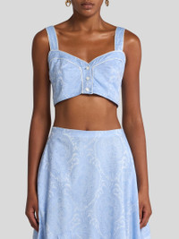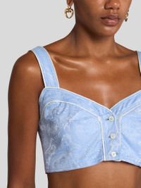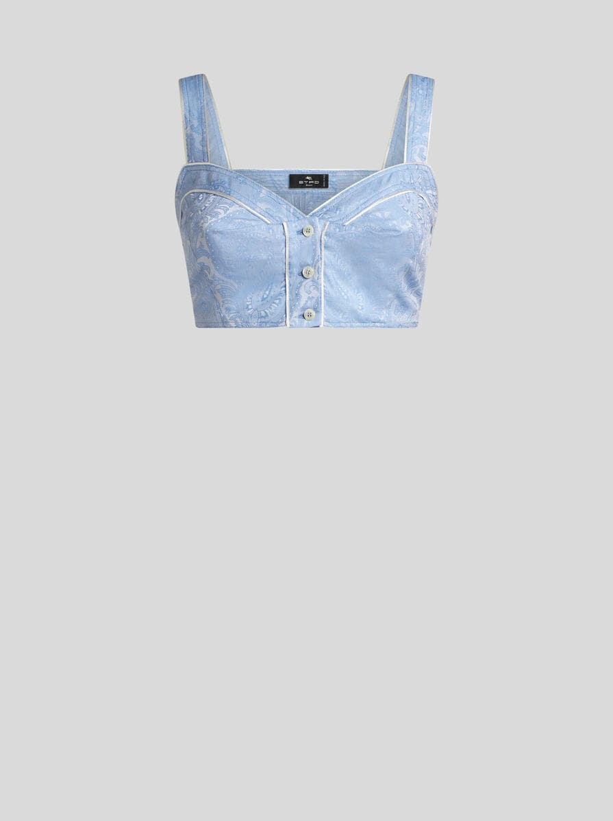 Pure cotton top with shoulder straps and logo-branded front buttons. This garment features a floral jacquard motif all over. • Sweetheart neckline • Shoulder straps • Branded-button closure • Made in Italy • The model is 5' 9½" (177 cm) tall and wears a size 40 PRODUCT DETAILS • 100% cotton