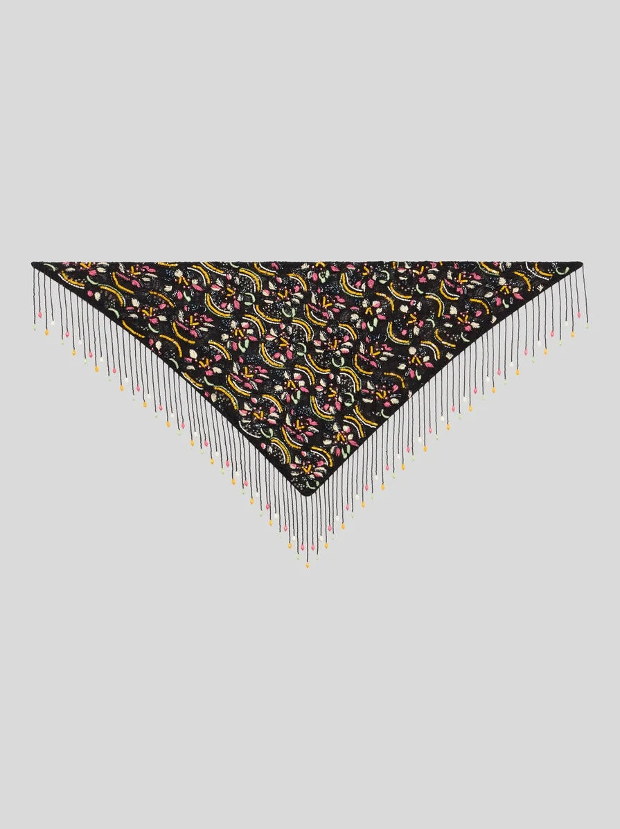 Triangular scarf with distinctive, refined lace detailing and embroidered foliage motif embellished with sequins and beads. Presented at the Spring/Summer 26 Runway Show, this accessory is complete with bead-adorned fringes along the edges. • Size: 19.7 x 29.5 x 19.7 inches (50 x 75 x 50 cm) • Made in India PRODUCT DETAILS • 86% polyamide, 14% elastane