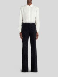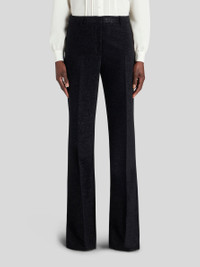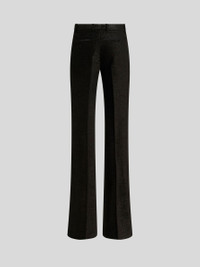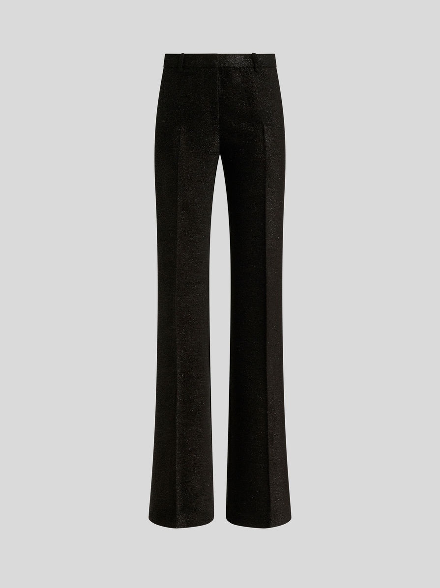 Lamé thread trousers featuring a flared bottom. PRODUCT DETAILS • 72% viscose, 17% modal, 11% polyamide • Regular fit • Average waist • Hook and zip fastening • Made in Italy • The model is 178 cm/70 inches tall and wears size 40