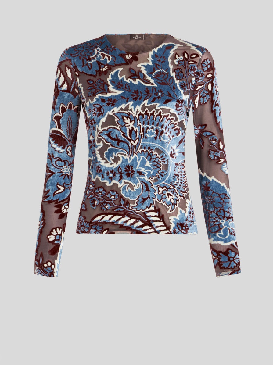 Stretch tulle top with jacquard velvet floral Paisley motif. The double-layered tulle fabric with see-through effect makes it stand out. PRODUCT DETAILS • 93% viscose, 4% polyamide, 3% elastane • Lining: 86% polyamide, 14% elastane