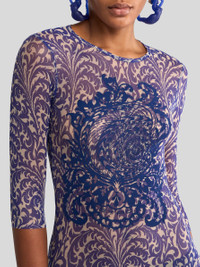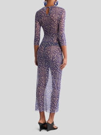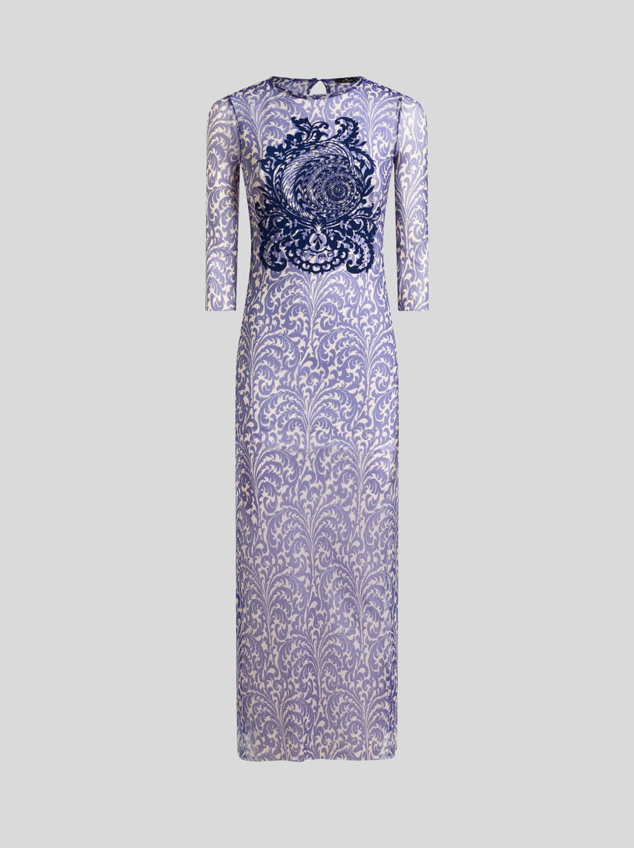 Long, slim-fitting dress with three-quarter sleeves, round neck and keyhole opening at the back. The item, made from see-through-effect tulle, features a palm tree-inspired print all over and a flocked maxi shell on the front. The item was presented at the Spring-Summer 25 Women's Runway Show. • Slim fit • Round neck • Three quarter-length sleeves • Keyhole opening at the back • Made in Italy • The model is 5' 9½" (177 cm) tall and wears a size 40 PRODUCT DETAILS • 93% polyamide, 7% elastane • Flock: 100% viscose • Lining: 93% polyamide, 7% elastane