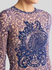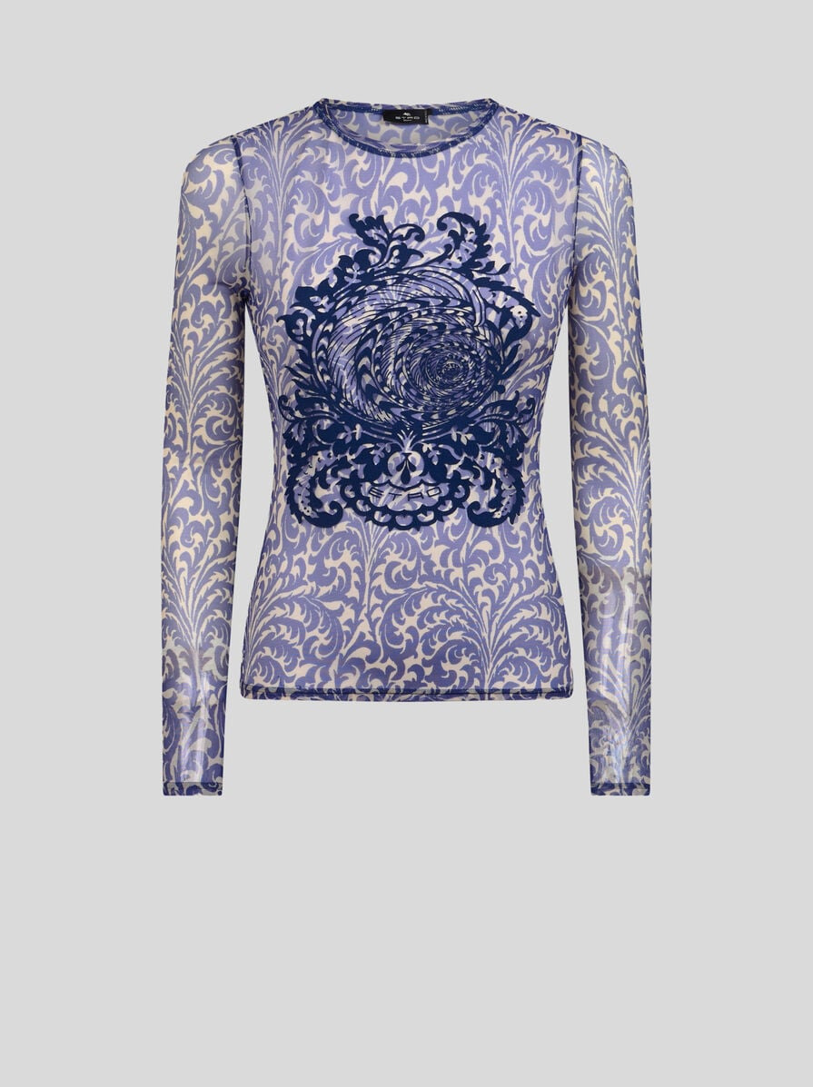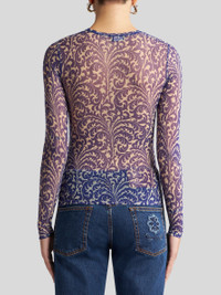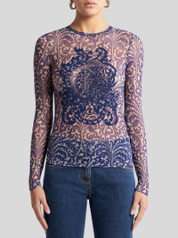 Slim-fitting sweater with long sleeves and crew neck. The item, made from see-through-effect tulle, features a palm tree-inspired print all over and a flocked maxi shell on the front. The item was presented at the Spring-Summer 25 Women's Runway Show. • Slim fit • Round neck • Long sleeves • Made in Italy • The model is 5' 9½" (177 cm) tall and wears a size 40 PRODUCT DETAILS • 93% polyamide, 7% elastane • Flock: 100% viscose