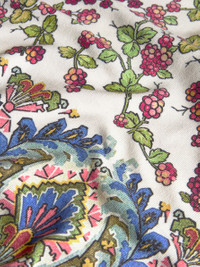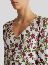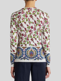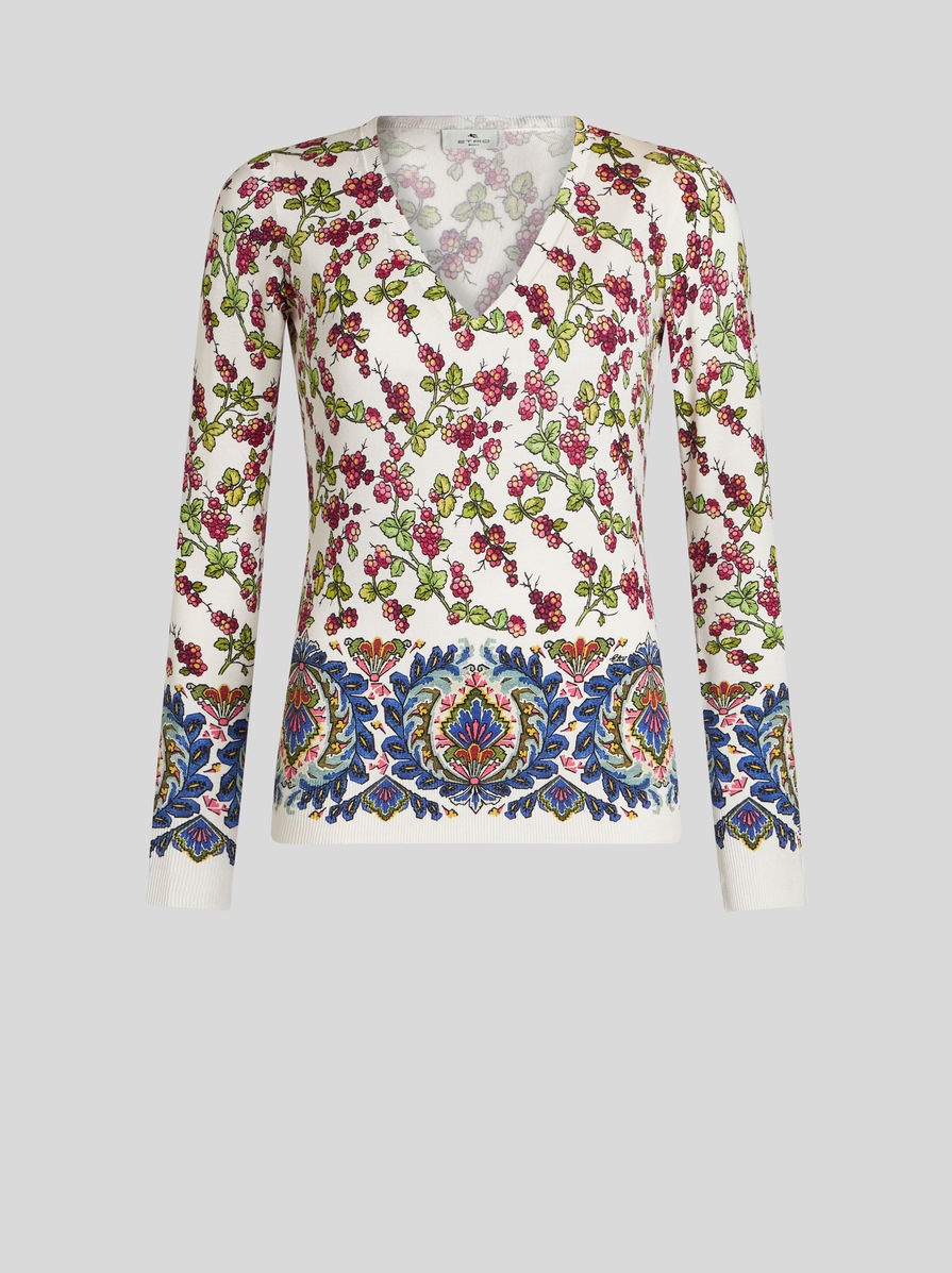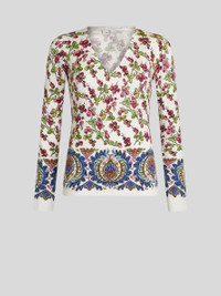 V-neck mixed silk jumper decorated by a Berry print and ornamental Paisley at hem. PRODUCT DETAILS • 85% silk, 15% elastane • Slim fit • V neckline • Ribbed neck, cuffs and bottom • Made in Italy • The model is 178 cm / 70 inches tall and wears size M
