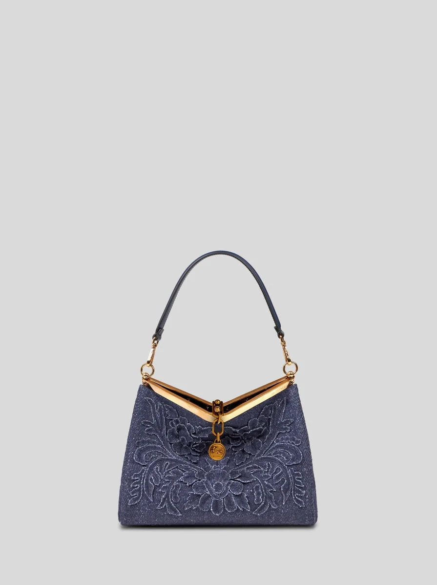 Iconic medium Vela bag in wool cloth with decorative, embroidered floral patch on the front. This model can be carried by hand or on the shoulder, thanks to the detachable, interchangeable shoulder strap and handle. This model stands out for its distinctive metal fastening and the medallion bearing the ETRO logo and Pegaso symbol engraved using the same technique used to mint coins. • Size: 8.46 x 11.02 x 4.33 inches (21,5 x 28 x 11 cm) • Detachable shoulder strap • Metal feet • Light golden-finish metal accessories • Made in Italy PRODUCT DETAILS • Embroidery: 100% wool • Details: 100% leather • Body: 100% wool • Lining: 100% leather
