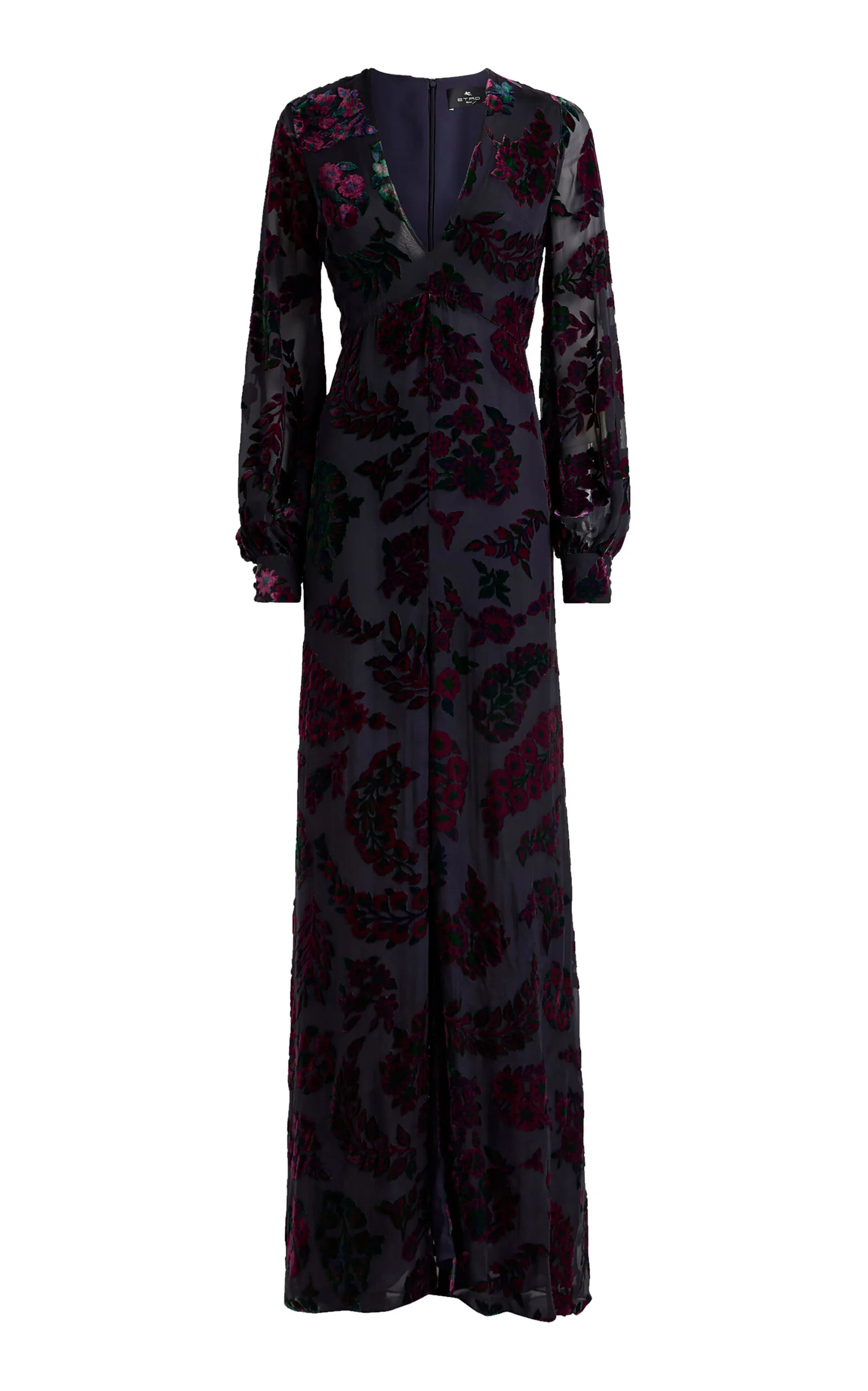 PRODUCT DETAILS - Long sleeve, V-neck, velvet burnout, front slit, maxi hem - Concealed zip fastening along back - Unlined - Composition: 63% Viscose, 37% Silk - Color: Stampa F.Do Blu - Dry clean only - Pre-Fall '25