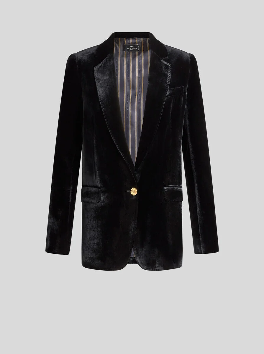 Straight-cut jacket in silk-blend velvet enhanced by metal buttons with a raised Pegaso logo. The inner lining features a striped pattern. • Regular fit • Classic lapels • Single-breasted closure with Pegaso button • Welt breast pocket • Side slip pockets with flap • Cuffs with Pegaso buttons • Made in Italy • The model is 5’10” (178 cm) tall and wears a size 40 (IT) PRODUCT DETAILS • 80% viscose, 20% silk • Lining: 52% viscose, 48% acetate